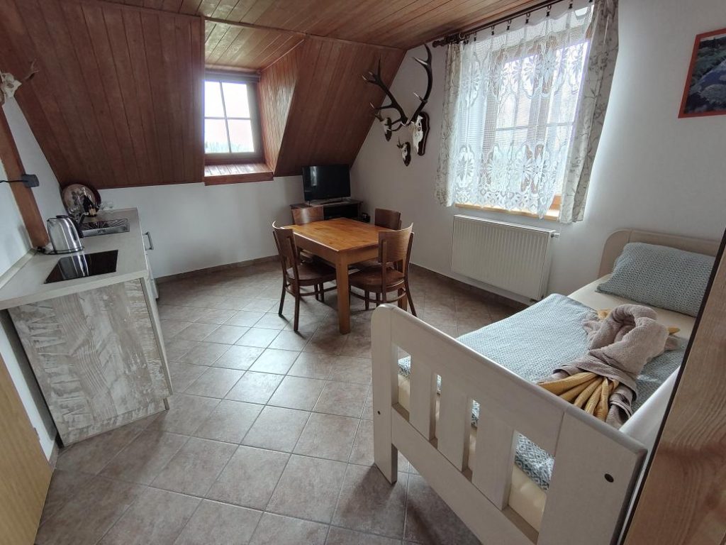Apartmán má 2 oddělená lůžka s hezkým výhledem, dva velké stoly z masivu, pohovku a lovecké dekorace.